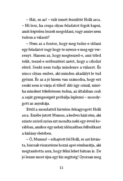 Holli szorongva indul a táborba, ahol a beilleszkedését nemcsak egy beképzelt osztálytárs ármánykodása, hanem a saját félelmei is jócskán megnehezítik. Ekkor szegődik mellé ismét Mumus, az apró házi rém, aki segít neki felismerni, hogy hibázni szabad, sőt jó is lehet! De hogy lehet a problémákra, megoldandó feladatokra kihívásként tekinteni? Holli varázskönyvében mindenki átalakulhat! Holli végigkalauzolja a gyerekeket egy nem mindennapi erdei kiránduláson, ahol a gyerekek is vele játszhatnak. Gyere, tarts Hollival és küzdd le te is az akadályokat!