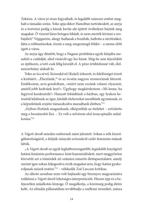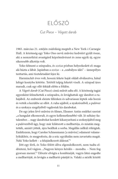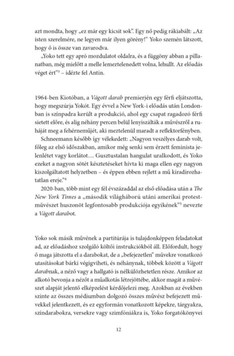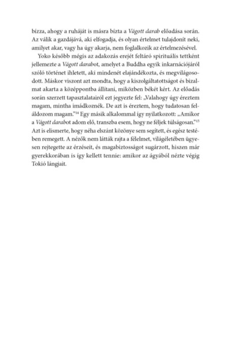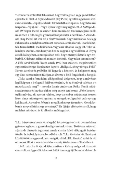 A könyv lapjain lebilincselően bontakozik ki kilenc évtized, egy feminista avantgárd művész és aktivista rendkívüli életének története. Sheff nem kerüli meg a sokakat foglalkoztató kérdést - milyen szerepet játszott Yoko Ono a Beatles feloszlásában -, de emellett méltó emléket állít a nőnek, aki bátran átlépte a határokat, és új utakat nyitott a művészetben.
