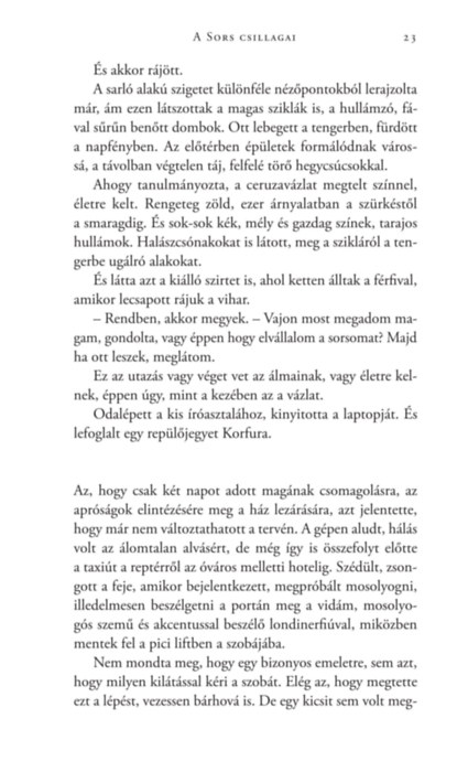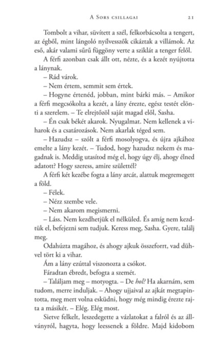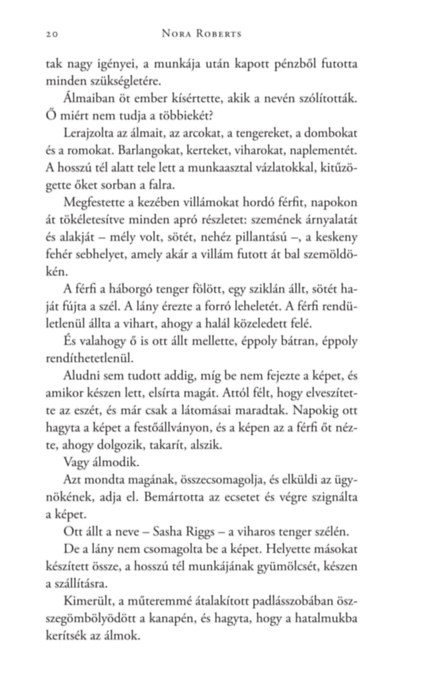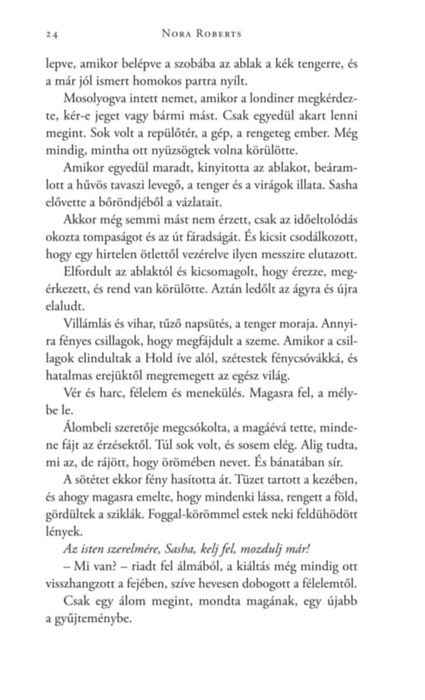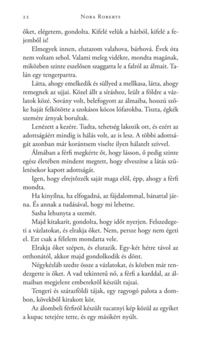 Nagyon fantáziadús fantasy történet. Egy bajom van vele, hogy míg régen Nora Roberts hagyta, hogy a szerelmes szereplői kibontakozzanak, észrevegyék, hogy szerelmesek, aztán meg kicsit tébláboljanak, mire be merik vallani egymásnak, mit éreznek, addig az utóbbi könyveiben túl gyorsan letudja ezeket a dolgokat, és minél előbb ágyba dugja a szereplőit… de így kissé hiányérzete van az embernek, nincs meg az az édes tétovázás, amikor izgulni lehet értük. Nincs kétely, egymásnak lettünk teremtve, pikk-pakk mindenki megtalálja a párjat, aztán gyerünk a küldetésre! Ezzel sincs baj, csak ezt nem romantikus regénynek, hanem fantasynak hívják.