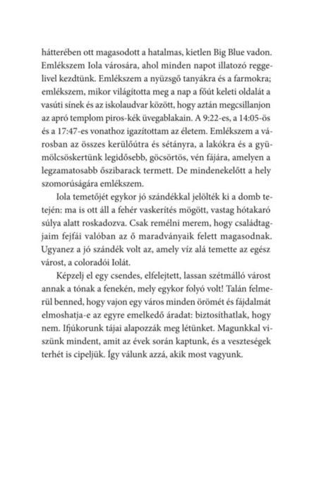 Felemelő regény a hatvanas években megsemmisült Iola városának igaz történetéről, egy különös szerelemről, a nehézségekkel való szembenézésről, a bátorságról, a kitartásról, a barátságról és az otthonról, amelyre ott is rálelhet az ember, ahol a legkevésbé várná. Shelley Read megmutatja, mit jelent úgy irányítani az életünket, mintha folyó lenne. Sok mindent összegyűjtve, áramolva, és az akadály ellenére mindig megtalálva az előrevezető utat.